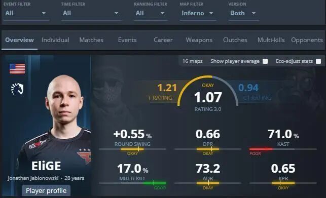 HLTV在阵容官宣后曾发文分析角色分配,指出换人理论上可行,但EliGE和rain必须在特定地图位置上互相让步。最终在Nuke和Inferno上,EliGE做出了妥协,让出了外场和A2楼的控制权,导致他在这两张地图的CT方Rating均低于0.95,远低于往常水准。