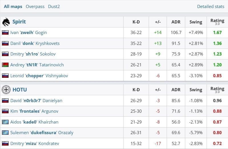 首图Overpass作为防守方的Spirit开局陷入落后,但zweih多次个人实力爆发配合队友助力Spirit取得优势,donk觉醒4杀取得9-3的半场领先。下半场Spirit稳扎稳打先取图一。进入图二Dust2,Spirit在donk的突破下打出前期领先,下半场更是神奇的残局偷包提前比赛进程,sh1ro狙击秀翻对手拿下比赛;而这是HOTU自第一阶段以来首尝败绩。