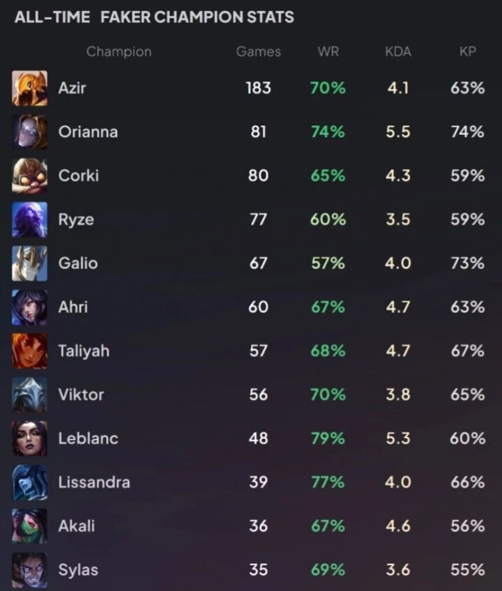 有外媒统计Faker职业生涯的英雄使用情况,具体如下: