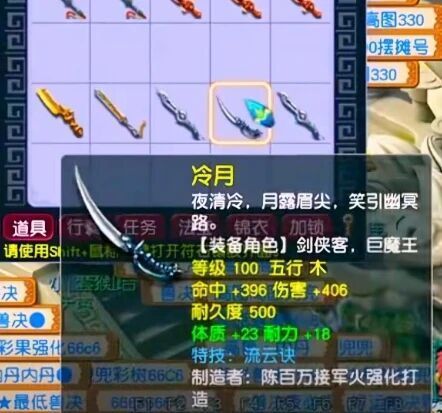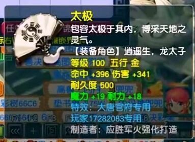 第四把是100级的扇子,伤害+325,耐磨双加+36,特技是笑里藏刀,特效是永不磨损。