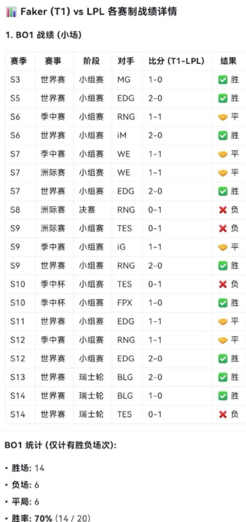 近期有网友整理了Faker自S3至S15(截至目前)对阵LPL队伍的战绩数据,结果显示:BO1胜率70%、BO3胜率50%、BO5胜率高达68.4%,若拆分到单局计算,他的胜率也达到64.66%,这样的数据直观地体现出,哪怕时光流转,Faker依旧是LPL队伍绕不开的“最大难题”。