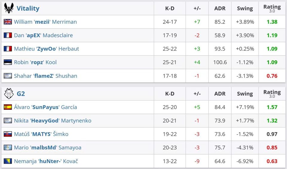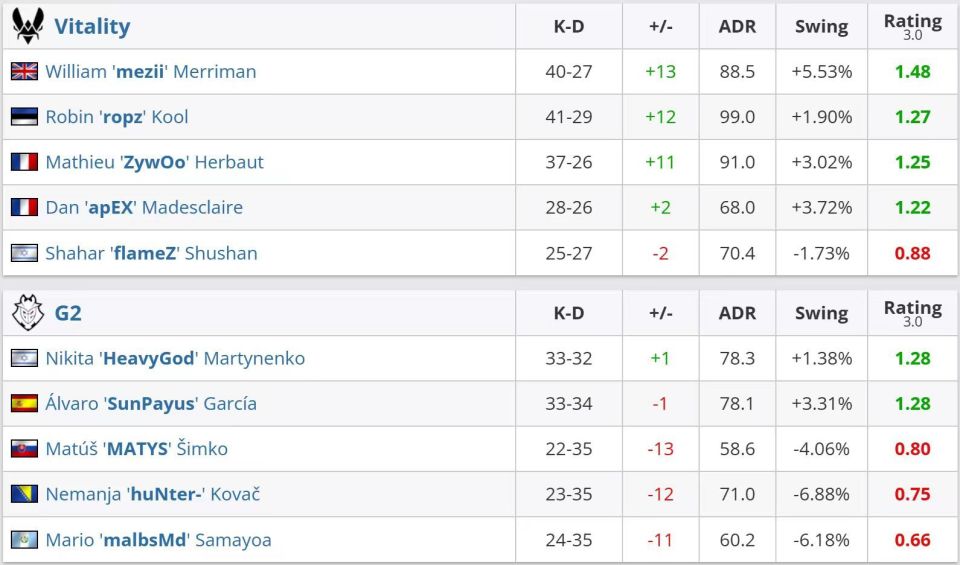 数据方面,mezii状态不错,拿到了全场最高的1.70rt,ropz和ZywOo同样拿到1.67和1.62rt;G2这边则仅有HeavtGod一人状态在线。