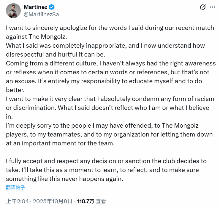 “我坚决反对一切形式的种族主义与歧视,此番言论完全违背了我的本心与信仰。谨向所有可能被冒犯的人们、The Mongolz队员、我的队友及俱乐部致以深切歉意——在战队关键时刻令各位失望,我深感愧疚。”