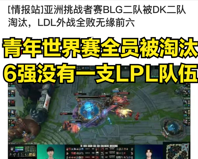近期举办的青年世界赛当中,LDL一共有8支队伍参赛,但是这八支队伍在小组赛当中被其他赛区的青训各种暴打,反观LCK赛区的青训战队,直接拿到6个小组的第一。目前LDL的实力跟外卡赛区的实力差不多,这就导致LDL只有BLG二队晋级8强,只不过LDL的夺冠希望BLG二队,在八进六的比赛当中被DK二队淘汰。