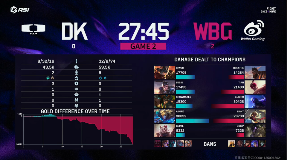 结果第二局比赛,DK仅打了前几分钟的好局,后续的比赛,被WBG接管,碾压获胜。8分钟左右,Breathe奎桑提勇敢前顶击杀Lucid,随后WBG团战拉扯更优取胜;9分钟左右,Tian盲僧大招串糖葫芦击杀Aiming,随后DK控下三虫;11分钟左右,Tian盲僧卡住视野突施冷箭,流畅连招单杀满血Aiming;13分钟左右,DK越塔击杀Tian,但随后Xiaohu传送赶到配合Light击杀DK四人;18分钟左右,Light飞机伤害爆表,WBG团战大获全胜完成0换5;20分钟左右,WBG站住地形率先拿下厄塔汗,随后Siwoo被集火瞬秒;23分钟左右,DK众人集火牛头未能击杀,WBG集结反打团灭DK并拿下小龙;最终27分45秒,WBG团灭DK,赢下比赛。