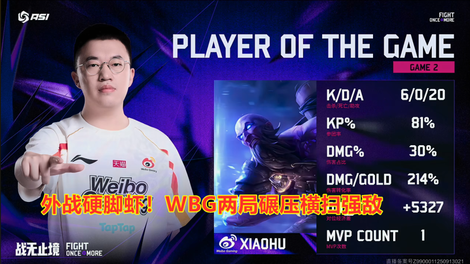 最终WBG零封DK,成为今年第二支大场战胜LCK的队伍,第一支为在EWC上,3:0战胜T1的AL。WBG的表现,堪称外战硬脚虾,内战软脚虾。昨天WBG输给了JDG,今天JDG又输给了GAM,这你敢信?