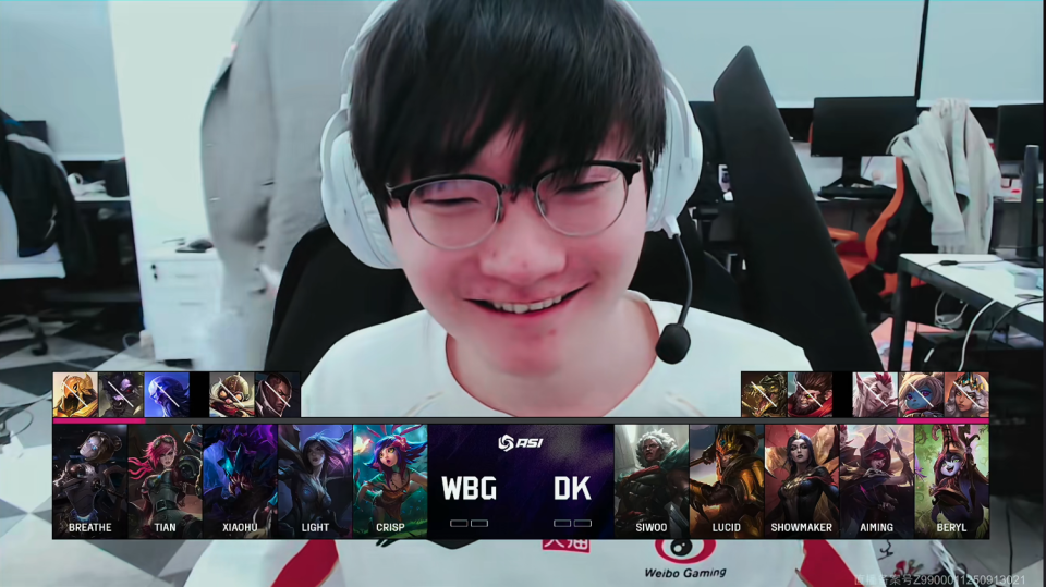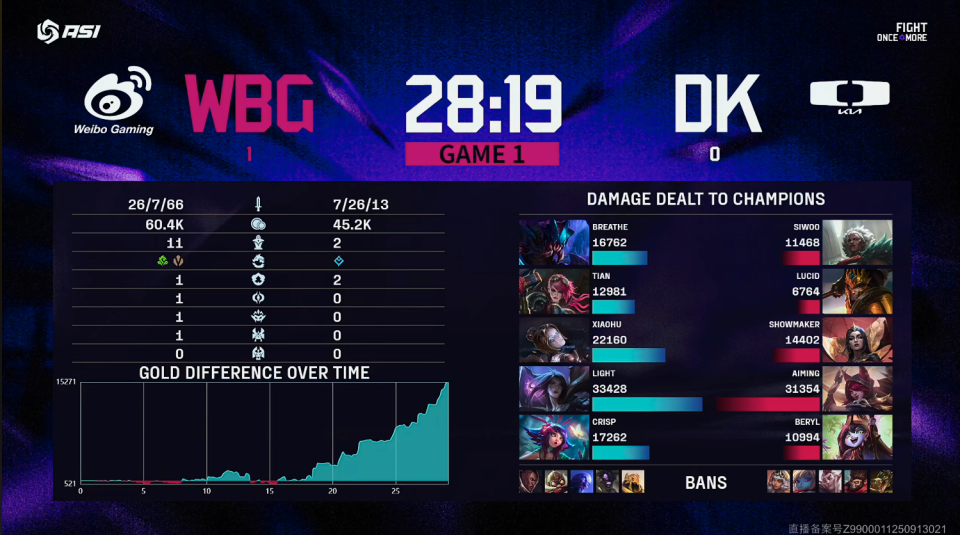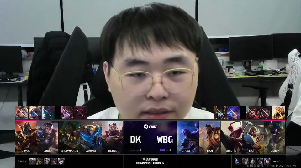 第一局比赛,WBG蓝色方,禁用:沙皇;牛头;瑞兹;飞机;卢锡安,选用:Breathe雷克赛;Tian蔚;Xiaohu发条;Light卡莎;Crisp妮蔻;DK红色方,禁用:奇亚娜;波比;洛;猴子;鳄鱼,选用:Siwoo狼母;Lucid皇子;ShowMaker妖姬;Aiming霞;BeryL露露
