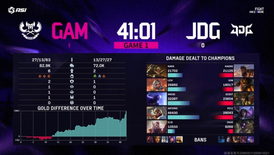 而昨天对阵GAM的第一局比赛又是出现了相似的剧本,JDG在前期拿到了一些优势,但中期一波失误全送了出去,越南队的兵长Levi一手奇亚娜全场超神帮助队伍逆转取胜。