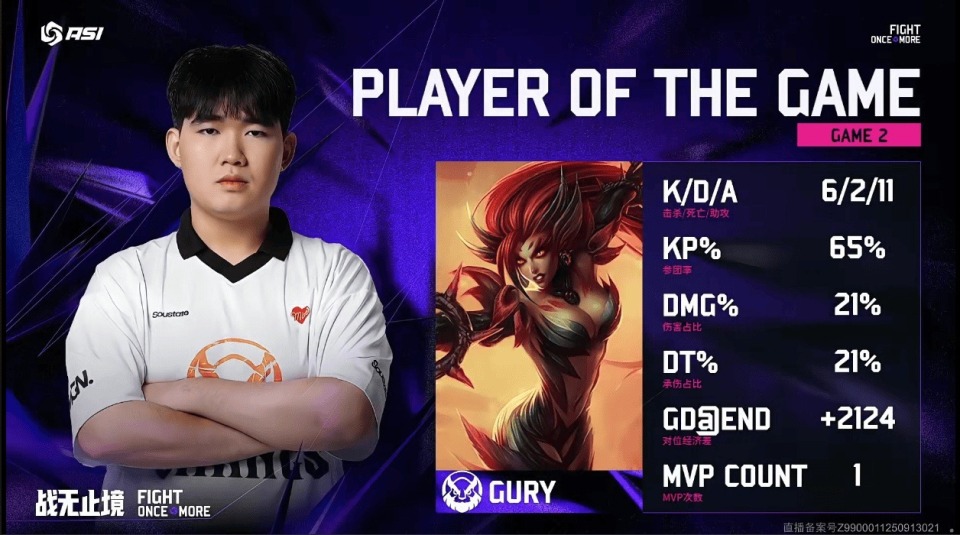 中期MVKE中流露推进,Niket牛头被秒,NIP配合不佳被打出0换4,MVKE拿下厄塔汗。24分钟naiyou死歌下路再被抓死,MVKE拿下第一条大龙。最终携带大龙buff,MVKE轻松推掉NIP基地,追回一局。MVP给到打野Gury的婕拉。