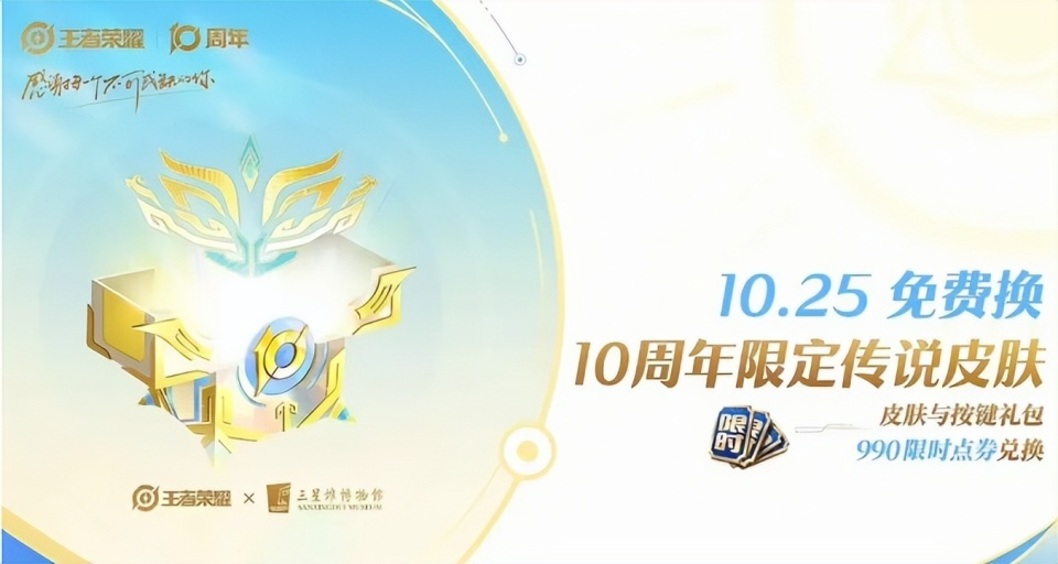 10月25日,也会上架10周年的传说限定,而这款跟“三星堆博物馆”联动的新皮肤,则可以通过990限时点券兑换,还会额外赠送个性按键。依旧是10月25日的10周年庆当天,只需要登录就可以领30x积分夺宝券。这也是历史上送积分夺宝券最多的一次,如果运气好的话,可以拿到一颗水晶哦!