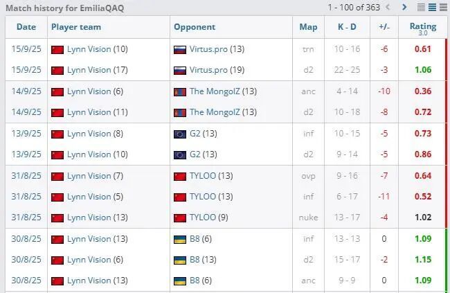 LVG近期个人发挥也不及预期。比如,在奥斯汀Major有着不错发挥的EmiliaQAQ在近期的赛事中的Rating表现低于其往常水准。近期比赛中,队伍整体状态下滑严重,难以形成有效的战斗力,导致队伍成绩断崖式的下滑。