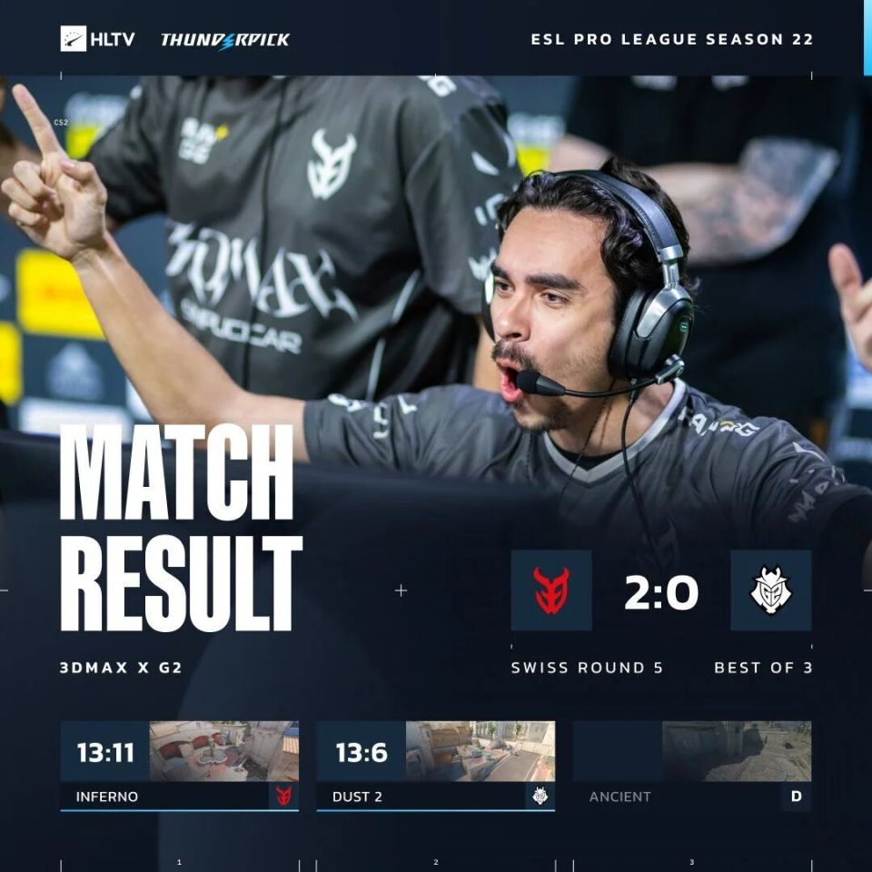 图一Inferno双方拉满24局,马尔布斯双拳难敌四手,3DMAX以两分优势惊险先下一城。图二Dust2上G2虽打出5-0完美开局,但随后迎接他们的是法国队的全员爆发,3DMAX从防守到进攻打出一波13-1狂潮终结比赛,G2以2胜3负遗憾倒在最后一轮。
