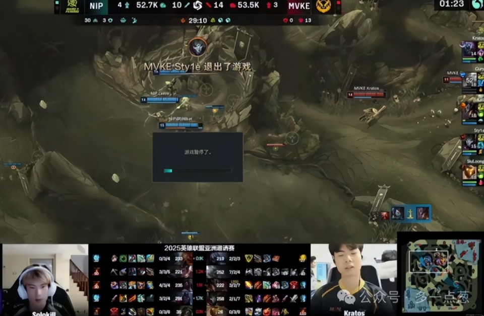 在NIP和越南队VKE的比赛中就出现了这一幕,这个时候双方已经打成了1:1平,第3局比赛一开始很明显就是VKE取得了领先,无论是经济上还是对线上都有不小的优势。然而令人意想不到的事情发生了,越南队所有选手集体掉线,这个时候NIP不仅击杀了VKE的两名选手,还顺势拿下了大龙。虽然后面进行了暂停,网络也恢复了,但是并没有进行回溯。正是因为如此,VKE在优势的情况下,因为全员掉线输掉了一波至关重要的团战,重新连回来的时候已经彻底崩了。