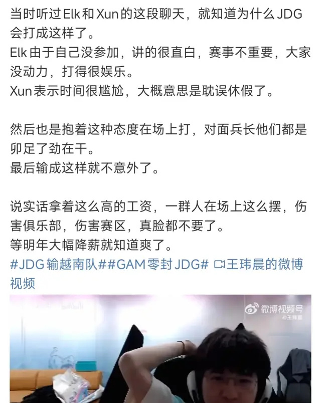 在JDG如此惨败战绩下,很多LPL观众都开始吐槽JDG管理层和选手不配拿高工资,毕竟GAM无论是网络延迟还是选手工资,都不如JDG战队,但是GAM却在bo3当中狂虐JDG。当然也有不少观众认为,JDG之所以输给GAM完全是因为JDG已经全员摆烂,甚至有观众拿出JDG打野xun和ELK的赛前对话来证明这件事情。