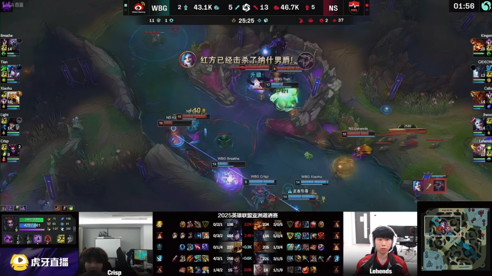 中期双方争夺厄塔汗,NS打野抢下厄塔汗。25分钟NS主动打大龙,Tian猪妹抢龙失败,NS拿下第一条大龙,击杀WBG四人后,拿下第二局的胜利。