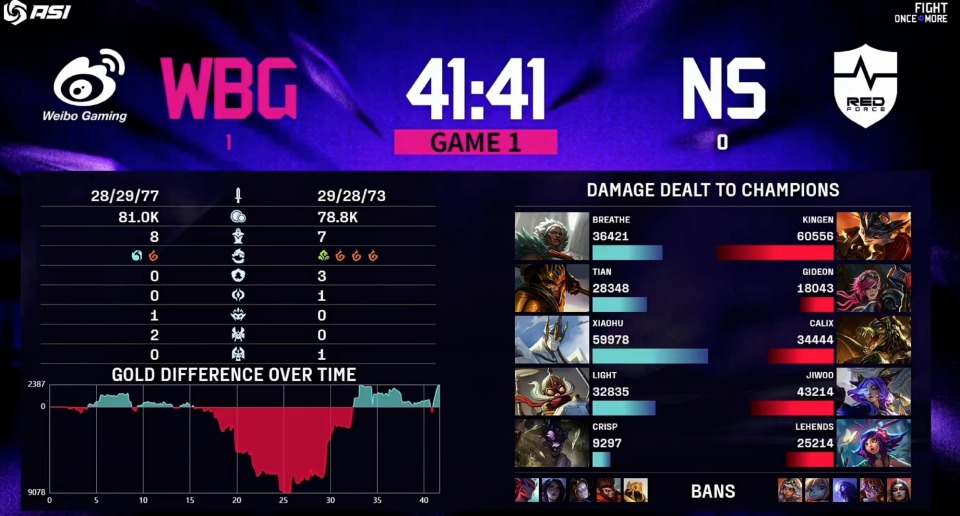 中期双方上路混战,Kingen兰博大招分割战场,Jiwoo芸阿娜伤害爆炸,NS打出0换3,但是Tian皇子抢下厄塔汗。25分钟WBG主动打大龙,NS鳄鱼切死Light飞机,WBG虽然拿下第一条大龙,但是Lehends妮蔻开团,NS团灭WBG。28分钟NS拿下听牌龙。后期32分钟双方河道混战,breathe安蓓萨进场切到Jiwoo芸阿娜,xiaohu加里奥大招进场,Tian皇子R三人,WBG团灭NS后,拿下第二条大龙。最终40分钟远古龙团战,Lehends妮蔻开团R四人,但是Breathe安蓓萨切到Jiwoo芸阿娜,双方打出1换1后,NS抢下远古龙,但是小虎加里奥完美发挥,WBG打出奇迹团团灭NS后,翻盘拿下第一局的胜利。首局伤害最高的是Kingen兰博,WBG这边伤害最高的是小虎加里奥。
