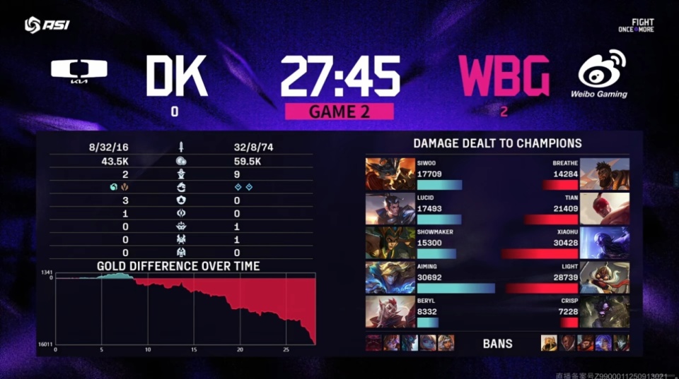 WBG在小组赛阶段的内战是被JDG横扫,但在之后对阵DK的比赛,竟然是打出了2-0的比分,而且打出了碾压局,尤其是第二局几乎是全场追着DK打,一场比赛打出了巨多的人头,这样的状态无疑是让观众们非常惊喜的。