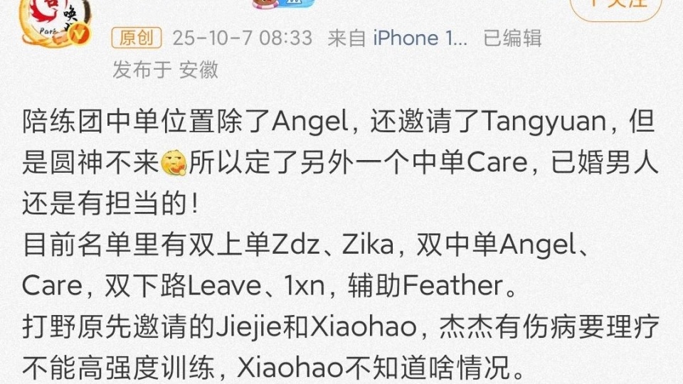 官方每个位置,应该是安排两个选手,组建两套陪练阵容,目前还没确定的,只有打野和辅助了,Jiejie因为伤病要理疗,没法参加,XIaohao应该是能去,虽然阵容看上去,确实有点弱,大部分选手都出自涅槃,但陪练也不需要太高的水平,T1之前的陪练KDF,也是在LCK常年垫底。