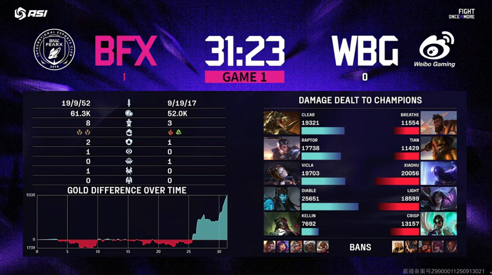 中期WBG光速拿下厄塔汗。25分钟BFX五人抱团在中路直接击杀WBG上单和AD,随后选择打大龙,WBG中野赶来阻止也被击杀,BFX顺利拿下第一条大龙。后期30分钟BFX在大龙坑接连抓死WBG上中2人,随后又在高地团灭WBG,拿下第一局的胜利。首局伤害最高的是Diable的滑板鞋,WBG这边伤害最高的是xiaohu瑞兹。