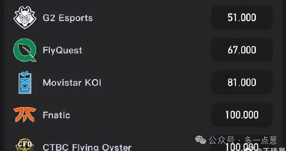 赔率榜的前8名基本都被LPL和LCK包揽了,有意思的是在赔率榜最底下有两支队伍,他们的赔率居然达到了100倍,这两支队伍分别是FNC和CFO。100倍这个倍率究竟有多夸张呢?可以说一个不太恰当的比喻,那就是将一枚硬币抛向地面,既不会出现正面,也不会出现反面,反而是竖着在。也就是说赔率达到了100倍,夺冠的概率基本没有。