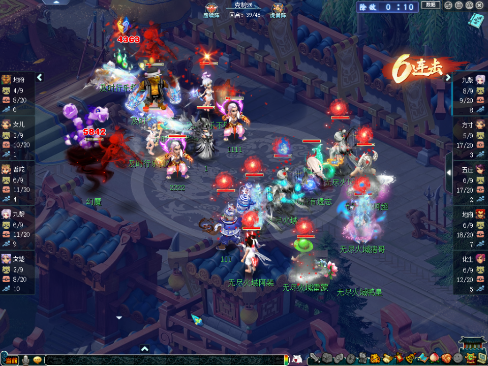 进入比赛后,【无尽火域】选用了“九黎、方寸、五庄、地府、化生”组成的“四保一”阵容,【及时行乐】选用了“地府、女儿、莲台普陀、九黎、女魃”组成的“点杀”阵容。