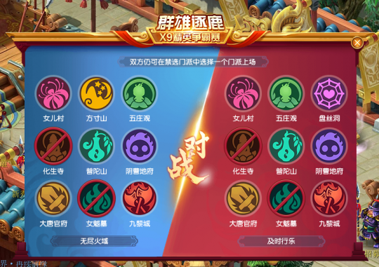 在禁选阶段,【无尽火域】和【及时行乐】均选择禁用对手化生、女魃,根据禁选规则,双方可以选择一个被禁门派复活。