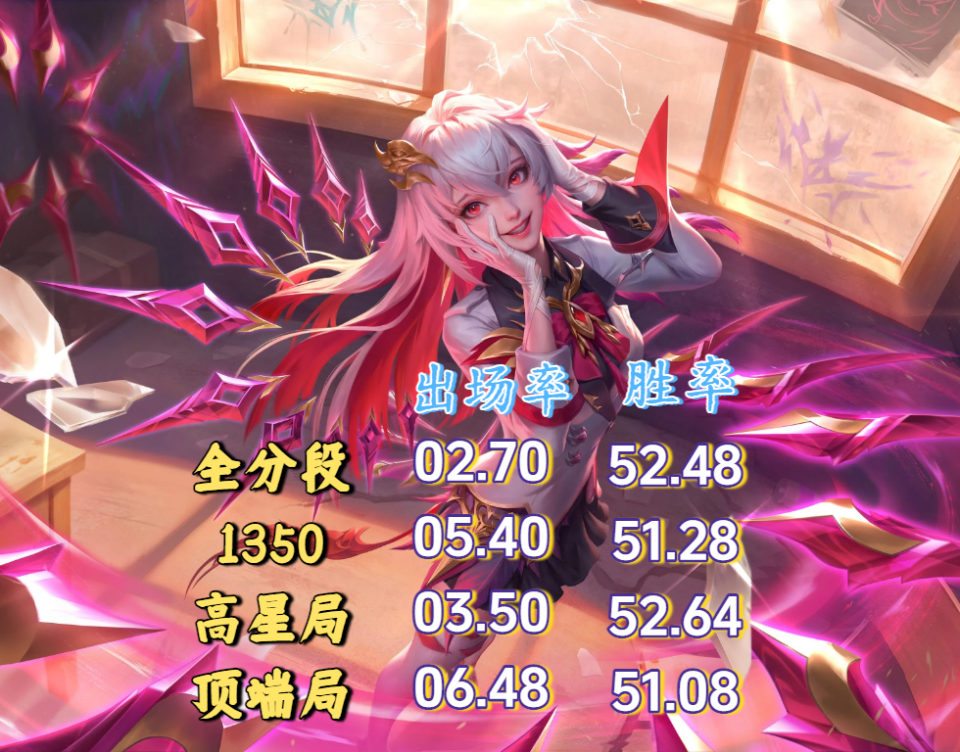 顶端局两大野王,似乎长期以来就没有掉下太多,尤其是镜皇,高端局低端局永远呈现两种极端的胜率反差,这个英雄非高玩玩不了,对手法要求是极致的,但如果能真正驾驭,你看看为啥大神都那么爱玩就知道了,上限高,胜率高,又长期被禁,属于非禁必选的英雄。