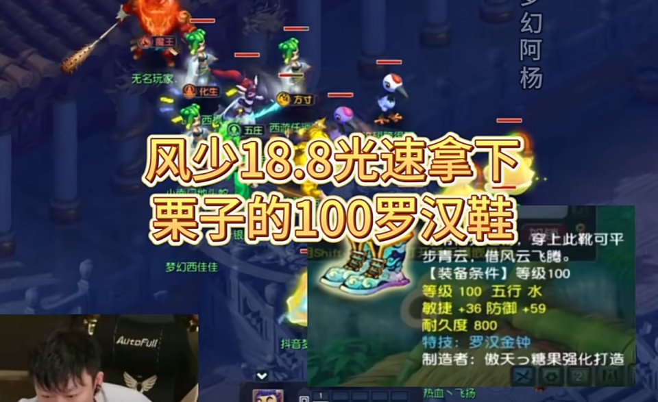 首先就是栗子出了一双100级的鞋子,敏捷+36,防御+59,特技是罗汉金钟,然后被风少18.8万光速拿下,正好他的女儿村可以用,其次很多人说贵了或者便宜的了,我觉得真的是友情价的,我记得建邺城一个罗汉女头都二十多万了,这下子宝哥团队的实力又在加强了!