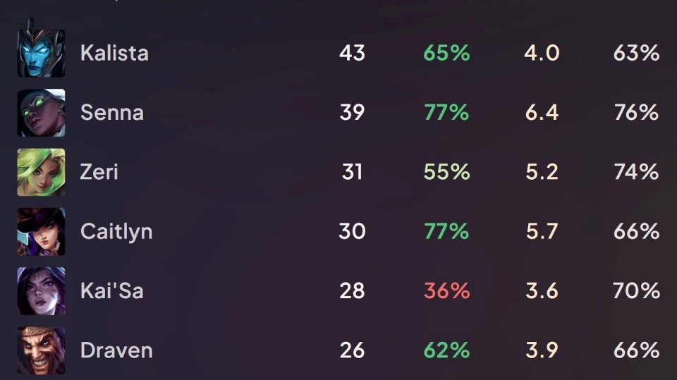 S15入围赛开赛在即,有网友在近日,分享了T1下路选手Gumayusi,职业生涯的英雄登场次数和胜率榜单,选取次数最多的是厄斐琉斯,一共玩了64场胜率64%,而胜率最高的是塞纳,39场胜率77%,在榜单的前12名里,有一个英雄的数据很尴尬,小吕布卡莎选用28次,胜率仅有36%。