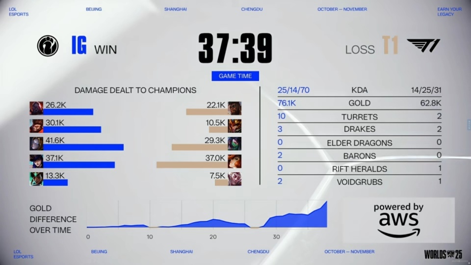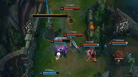 最后IG在14分钟才拆掉一血塔,随后T1尝试TP绕后打团但IG支援赶到双方技能互换后没出现伤亡,但后续Doran出现失误先手大招效果不好反而被IG击杀。