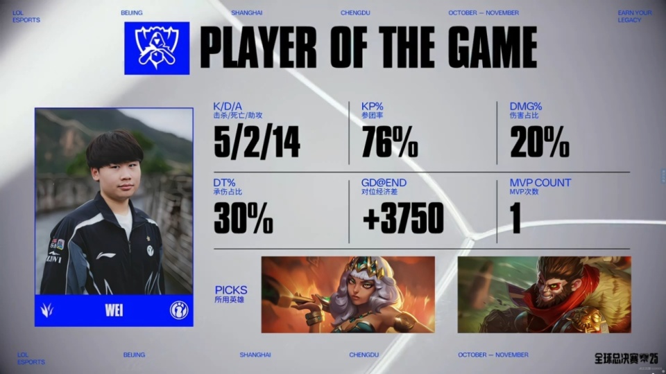 WEI猴子发育出色后野区不断先手辅助打消耗,35分钟抓住皇子位置,Rookie果断大招拉回随后WEI果断开团配合队友击杀后顺利拿下大龙。
