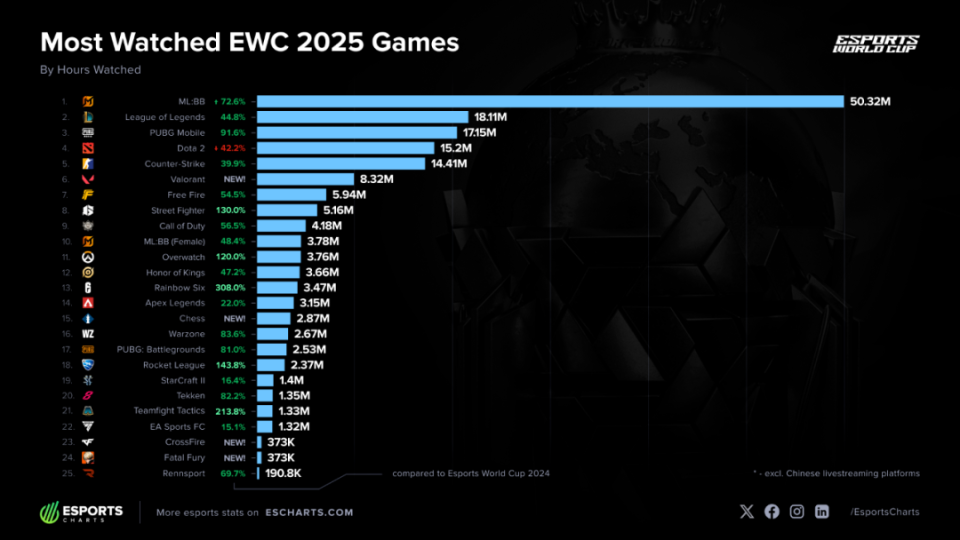 实际上,格斗游戏的社交性在某些方面并不低。比如话题度和电竞热度,时至今日,《拳皇97》在互联网上仍然有着不低的热度。今年的EWC上,《街头霸王6》总观看时长排到所有25个项目中排到第8位,同比增长130.0%。