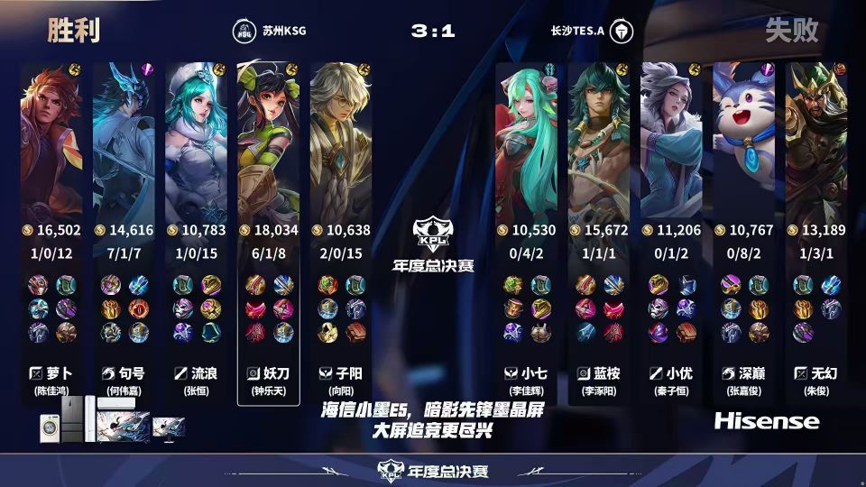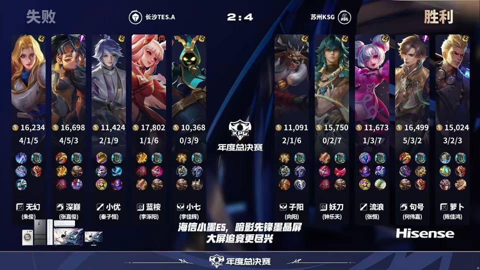 最后一局KSG虽然赢了但是很离谱,早早就领先了六七千经济,也推掉了三路高地。但推水晶时子阳开团着急了,只有句号能跟,伤害不够,反而是妖刀没人保被深巅切死了,句号位置太深也被蚩奼击杀,TES一波零换二守了下来。