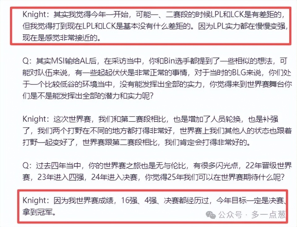 左手就在采访中表示,可能在第1赛段或者是第2赛段的时候,自己还认为LPL和LCK还是有一点差距的,但是打到现在,自己认为LPL和LCK基本没有什么差距,LPL的实力是在慢慢变强,现在已经非常接近LCK的整体水平了。因为自己在世界赛经历过16强4强决赛都经历过,所以今年的目标一定是进决赛拿到冠军。