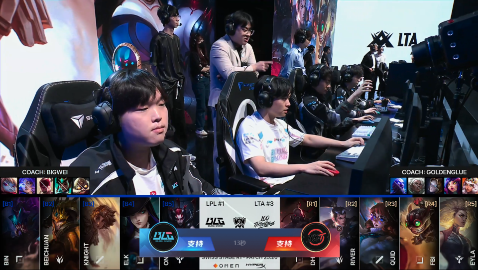 第一局比赛,BLG蓝色方,禁用:波比、芸阿娜、盲僧、卡尔玛、飞机,选用:Bin雷克塞、Beichuan皇子、Knight岩雀、Elk女警、ON蜘蛛;100T红色方,禁用:奇亚娜、妮蔻、发条、安蓓萨、瑞兹,选用:Dhokla塞恩、River赵信、Quid阿萝拉、FBI炸弹人、Eyla芮尔