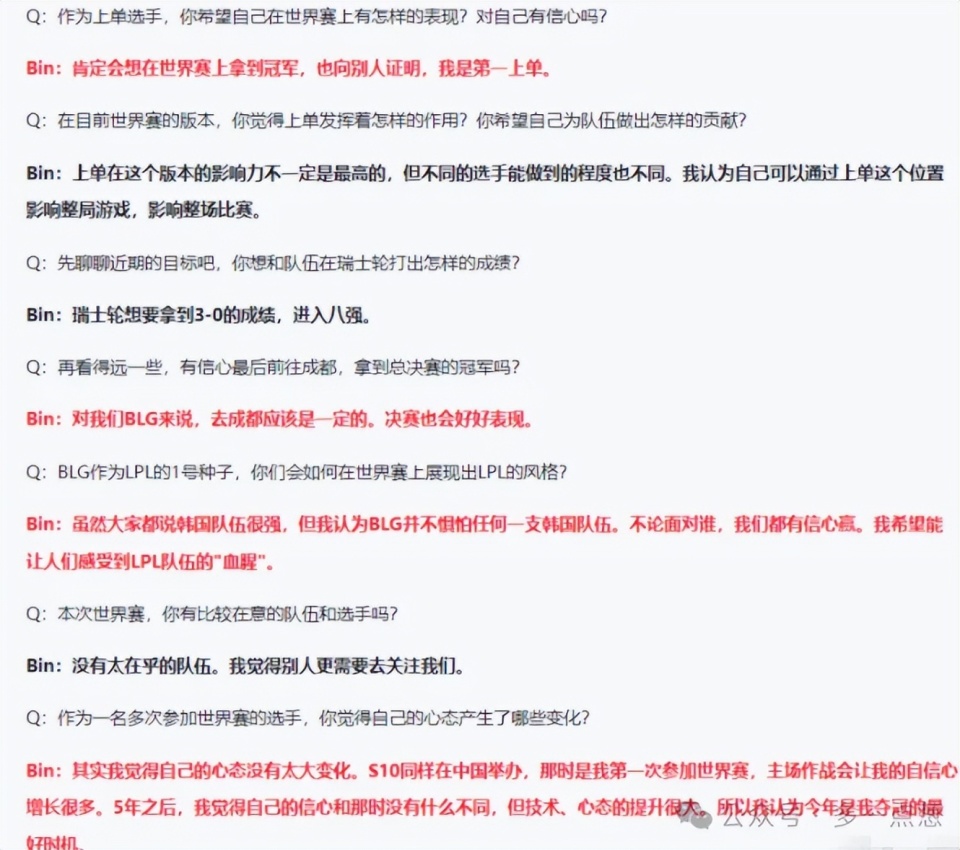 Bin在采访中就直接表示,我肯定想在世界赛中拿到冠军,同时也会向别人证明我是第一上单。现在这个版本中上单的影响力不一定是最高的,不同的选手所做到的程度也是不同的,我认为自己可以通过上单这个位置影响整局游戏,影响整场比赛。对于BLG来说肯定会去成都的,也就是一定会进入决赛。虽然大家都说韩国队伍很强,但是我认为BLG并不惧怕任何一支韩国队伍,无论面对是谁,我们都有信心赢,都能让人感觉到我们LPL的血性。S10在中国举办,那是我第1次参加世界赛,主场作战让我自信心增长很多,5年之后我觉得自信心和那时没有什么不同,但是技术和心态都有很大的提升,我认为今年是我夺冠的最好时机。
