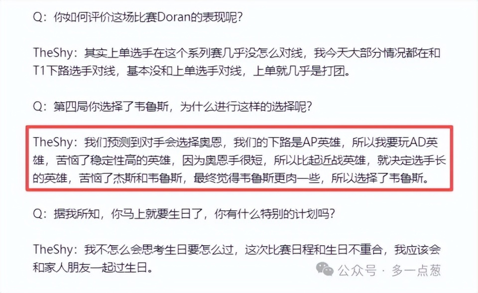 Theshy在接受韩国媒体采访的时候,就亲自解释了为什么会拿出韦鲁斯这个英雄?Theshy就在采访中表示,我们已经预测到了对手可能会拿奥恩,我们的下路是AP英雄,所以我玩AD英雄。苦恼了稳定性高的英雄,因为奥恩手比较短,所以比起近战英雄,我决定拿出手长英雄。在当时苦恼了杰斯和韦鲁斯,最终觉得韦鲁斯更肉一点,所以选择了韦鲁斯。