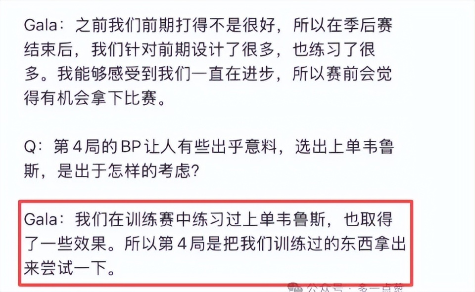 除此之外,Gala早在采访中就给出了答案,Gala就表示我们在训练赛中练习过上单维鲁斯,也取得了效果,所以我们只是把训练过的东西拿出来尝试一下。很显然上单维鲁斯是他们在训练赛中使用过的,而且还是有效果的。同时丹尼教练也是回应自己的BP做的是不错的,没有任何问题。至于选择维鲁斯,就是因为炸弹人需要持续输出的AD来配合,维鲁斯不仅有控制技能还加强了装备,效果很好,Theshy也完全不怕承担这个角色,所以我们提前准备了这一点。对错其实是结果论,如果再次回到当时,我依然还会做出同样的选择,因为我们就是这样准备的。