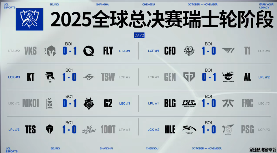 10月17日将进行2-0组的比赛(比赛为BO3),胜者直接晋级八强。10月18日进行1-1组的比赛(继续BO1分组),10月19日进行0-2组的比赛(比赛为BO3),败者惨遭淘汰。