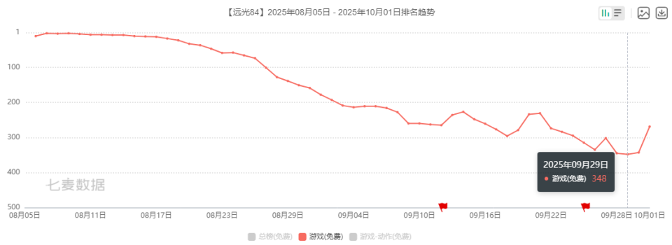 上线仅一周,《远光84》便颓势尽显,七麦数据显示,游戏在公测首日仅冲到了App Store游戏畅销榜第180名,7天后便彻底在TOP250中消失,再也未能回来。App Store游戏免费榜方面,游戏也掉到了第300名开外。据FoxData预估,《远光84》在iOS端的首周收入仅有25000美元左右。