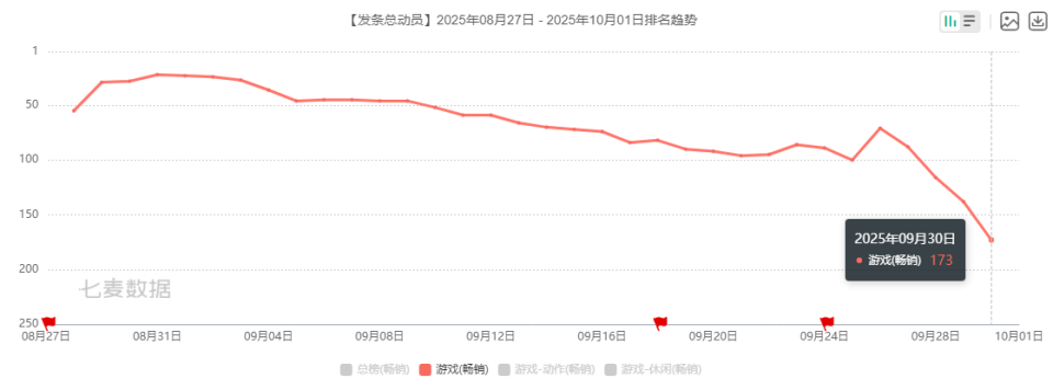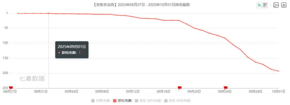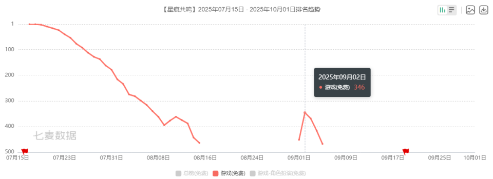 七麦数据显示,《星痕共鸣》在公测首日,曾冲到了App Store游戏免费榜第一的位置,但后续快速下滑,虽在9月初冲到了第346位,但还是很快掉出了TOP500的行列。