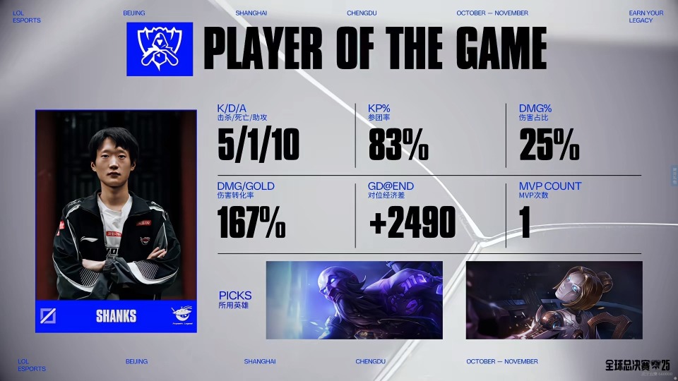 中期23分钟CFO在下路抓死hope炸弹人,之后主动打小龙,但是Tarzan赵信抢下小龙,随后AL继续打厄塔汗,junjia潘森野区被发现后击杀,AL顺利拿下厄塔汗。27分钟CFO野区开团,想开kael女坦,但是圣枪哥安蓓萨搅乱后排,以及shanks发条完美大招,AL打出1换4后拿下第一条大龙。最终30分钟AL在高地击杀CFO两人后,追回一局。MVP给到了shanks发条。