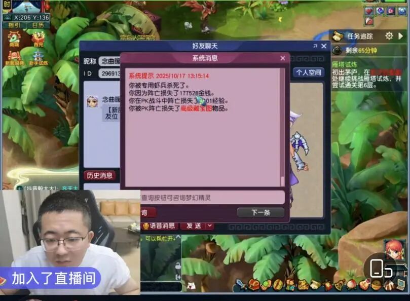 掉了十几万的钱跟一张高级藏宝图,哈哈,这应该是大斌子在齐天大圣区的首挂,而且就得多点这些玩家对针对宝哥、斌哥、初九之类的,这样才游戏体验,全部都被人捧着赞扬着玩有啥意思!