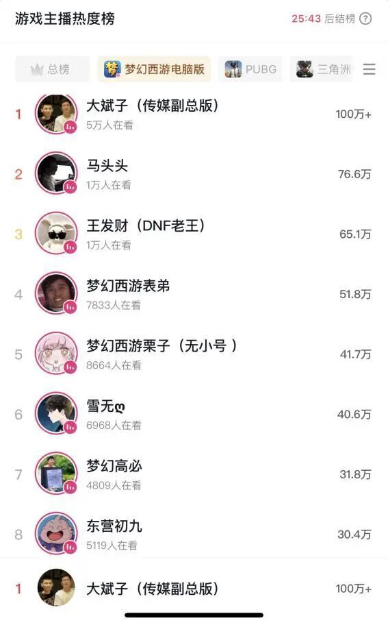 昨天齐天大圣12点开服以后,基本上排名前二十的主播都是在直播齐天大圣的,因为热度高涨,其中人气高的有几万人,低的也有几千人,直接给梦幻的流量拉满了,其中人气最高的莫过于大斌子,因为宝哥说要自己升级到30级,所以他的畅玩服的代练麻包包就没开直播,所以人气最高的就是大斌子了!
