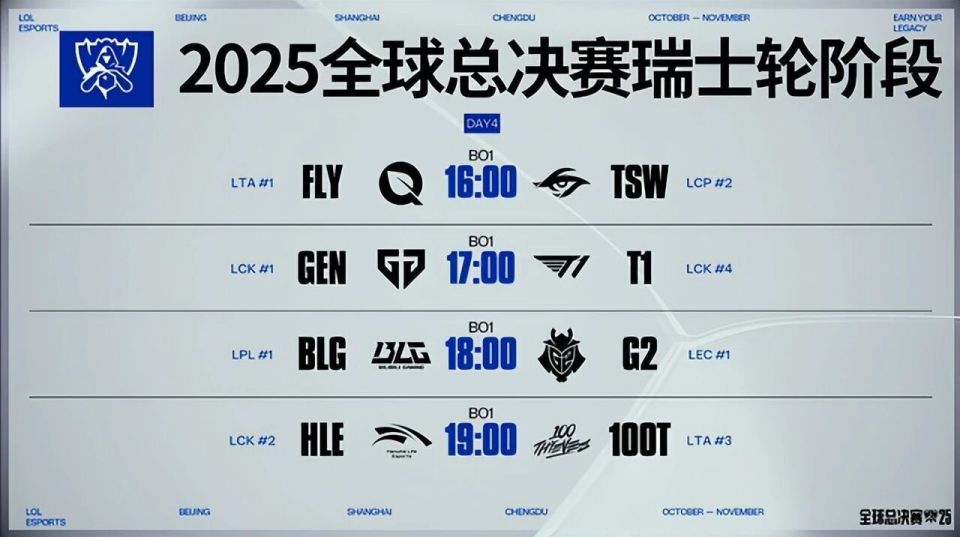 经过前三轮的较量,16战队之间的强弱,已经有了大概的体现。特别是第三天TES爆冷0-2负于KT。那么第四天的比赛,就轮到1-1组,G2对阵 BLG,GEN对阵T1,TSW对阵FLY,100T对阵HLE。在率先结束的比赛中,FLY战胜TSW;GEN摸清T1底细,轻取T1;那么,今天的焦点之战G2和BLG,他们会带给什么样的惊喜,让我们一起来期待一下吧