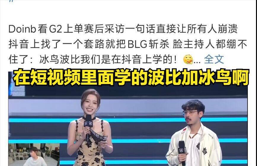 G2在打赢BLG后,G2上单波比和中单冰鸟的阵容搭配,也是引起很多LPL观众的热议,而LPL主持人也是询问G2选手,为啥会在比赛当中选出这个阵容搭配?而G2选手坦言,这是自己在中国刷短视频的时候看见的阵容搭配,自己感觉这个阵容很克制瑞兹这个英雄,所以才会选择这个阵容。(不得不说G2选手学习能力很强,波比和冰鸟的搭配确实是国产的经典搭配)