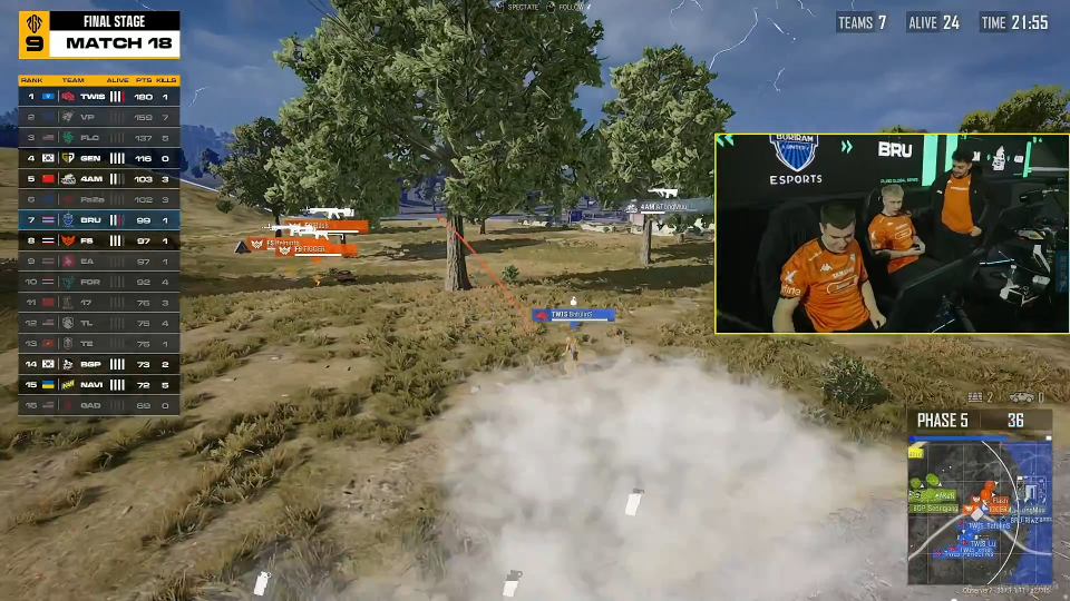决赛最后一场刷了个偏东部的圈,17和TL遭遇后被NAVI劝架收割,两队早早淘汰出局,4AM也是前期被FLC打了一个后又要和对面抢点,好在身后有FS缓解了一波压力,双方尬在了冠军房里。阶段5圈形刷新,BRU估计想抢下冠军房后站住圈边反坡,这下刚好撞到FLC脸上,FS更莽夫,直接一个车队停到圈边反坡架住冠军房的队伍,没想到还有更离谱的,TWIS直接从圈内房区拉出来要请FS,分高就是快乐,最终4AM分数定格在103分。