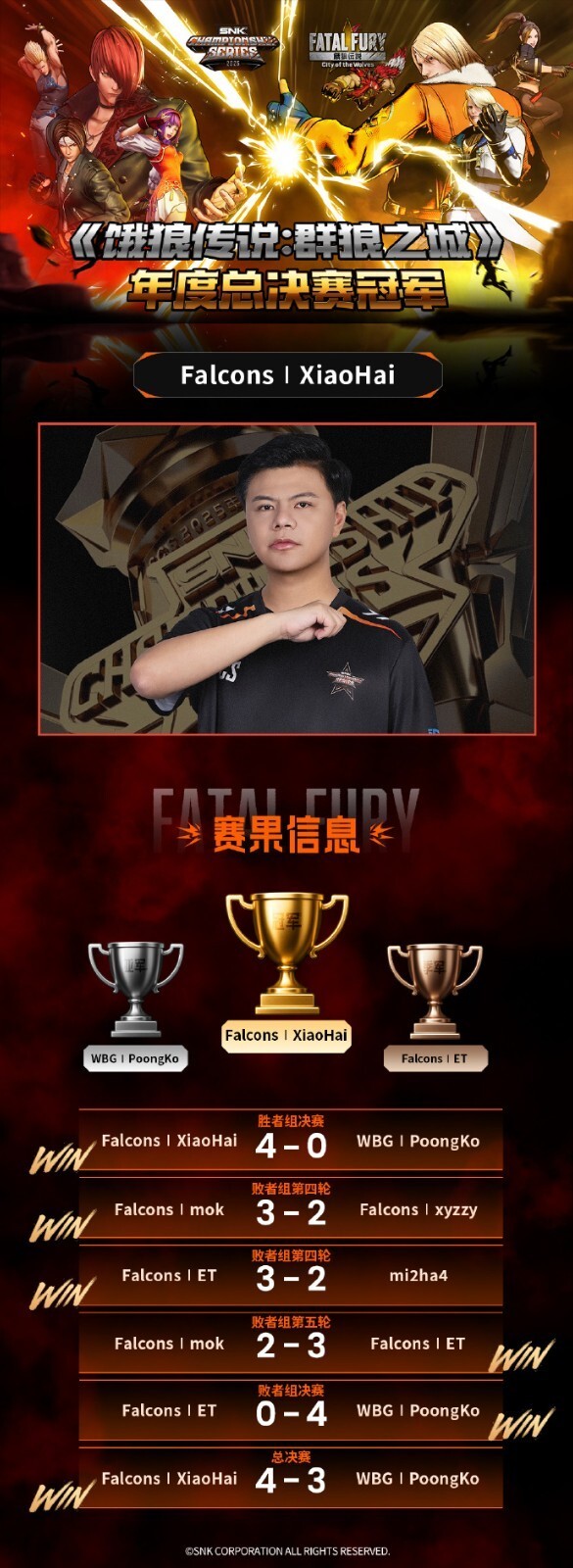 近日,SNK冠军系列赛(SCS)2025《饿狼传说:群狼之城》年度总决赛正式结束。中国电竞选手“小孩”曾卓君在《饿狼传说:群狼之城》项目中击败韩国选手WBG|PoongKo,成功夺得年度总冠军!
