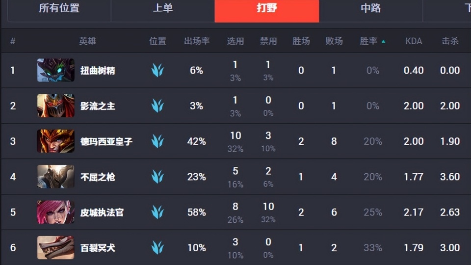 狼母在上单位,也有点版本陷阱,登场9次4胜5负,胜率仅有44%,大部分队伍都会选狼母打塞恩,或者是奥恩这种英雄,但对线其实压不死,而且团战作用没有坦克大,中单位置,登场率最高的瑞兹、岩雀,都没有想象中那么强势,胜率只有33%和41%,跟兔子的67%胜率差距不小。