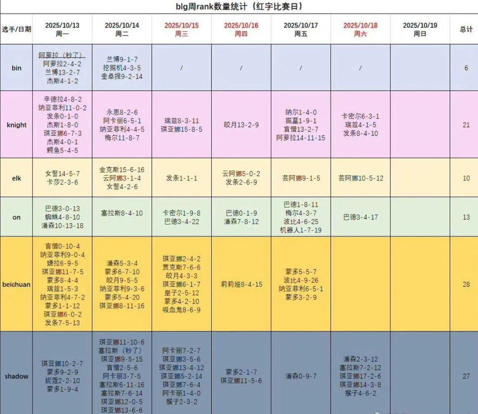 在此次S15的舞台上,由于BLG成绩不佳,甚至输给了100T。因此,不少玩家对他们的要求也是愈发严格了起来,开始逐字分析BLG的采访,并且对于选手的比赛表现,也是一点细节都不放过。更有玩家认为BLG状态这么差,与他们的训练赛肯定有着极大的关系,便开始统计起了BLG全员的rank记录,这一查可就查出问题了,BLG的首发三人,Bin、Elk以及ON近期沉迷斗魂竞技场,无心rank训练。